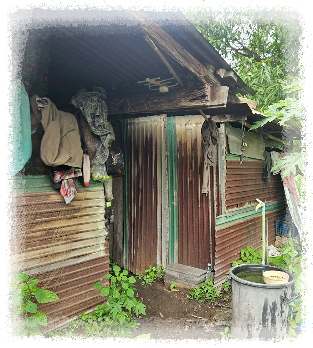 บ้านหลังเล็กของครอบครัวแค่เดินเข้าไปก็เห็นกาละมังใบใหญ่ 2 ใบ ตั้งไว้รองน้ำฝนจากหลังคารั่ว ไฟฟ้าแสงสว่างในบ้านมีเพียงหลอดไฟ 1 ดวง โทรทัศน์เก่า 1 เครื่อง บ้านนี้ไม่มีตู้เย็นถึงแม้มีผู้อยากบริจาคของเก่าให้ พ่อก็ไม่รับ เนื่องจากกังวลเรื่องค่าไฟฟ้าที่จะสูงขึ้นและจ่ายไม่ไหว บ้านนี้มีแค่หม้อหุงข้าวเก่า ๆ ไม่มีเตาแก๊สใช้ เวลาทำกับข้าวก็ใช้เตาฟืนที่หาเก็บไม้จากใกล้ ๆ ถึงแม้รอบบ้านพอมีที่ว่างก็ไม่กล้าปลูกผักสวนครัว เพราะกลัวว่าค่าน้ำประปาชุมชนที่ใช้จะสูงกว่า 60 บาท ที่จ่ายทุกวันนี้