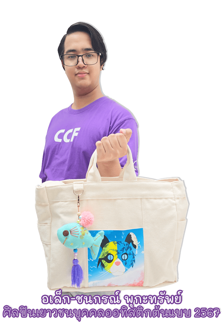 กระเป๋าผ้า ซึ่งเป็นการ Collaboration งานออกแบบระหว่าง อเล็ก-ชนกรณ์ พุกะทรัพย์ เยาวชนบุคคลออทิสติกต้นแบบ ประจำปี 2567 ศิลปินเด็กพิเศษ ผู้ออกแบบงานสร้างสรรค์ Digital Art และเด็ก ซี.ซี.เอฟ. จากโครงการปั้นเยาวชนคนมืออาชีพ มูลนิธิ ซี.ซี.เอฟ. เพื่อเด็กและเยาวชน ในพระราชูปถัมภ์สมเด็จพระเทพรัตนราชสุดาฯ สยามบรมราชกุมารี
