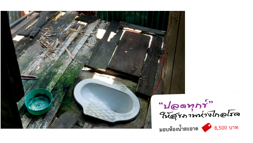 "สุขา" หรือ ห้องน้ำ ในบ้านเด็กยากไร้อีกมากมาย ยังเป็นเพียงฝากั้น ไม่มีหลังคา ไม่สะอาด ไม่ถูกสุขอนามัย ไม่มิดชิดและปลอดภัย เต็มไปด้วยเชื้อโรค ก่อให้เกิดปัญหาด้านสุขภาพต่อเด็กและครอบครัว
